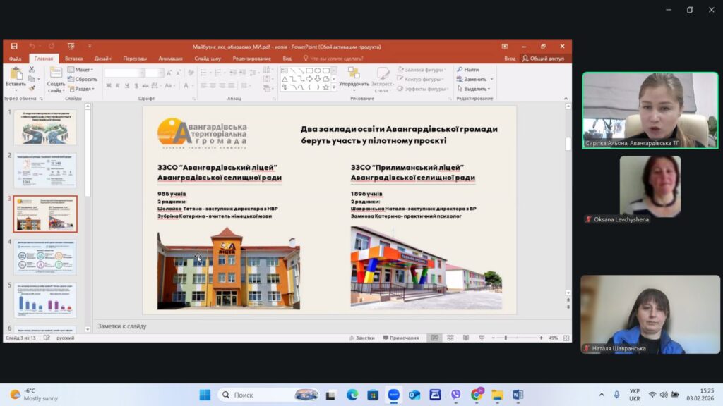Кар’єрний координатор Авангардівської громади Альона Сирітка поділилася досвідом проведення опитування та презентації аналітичного звіту за його результатами в нашій громаді. Цей досвід отримав позитивну оцінку та був відзначений менторами проєкту DECIDE.